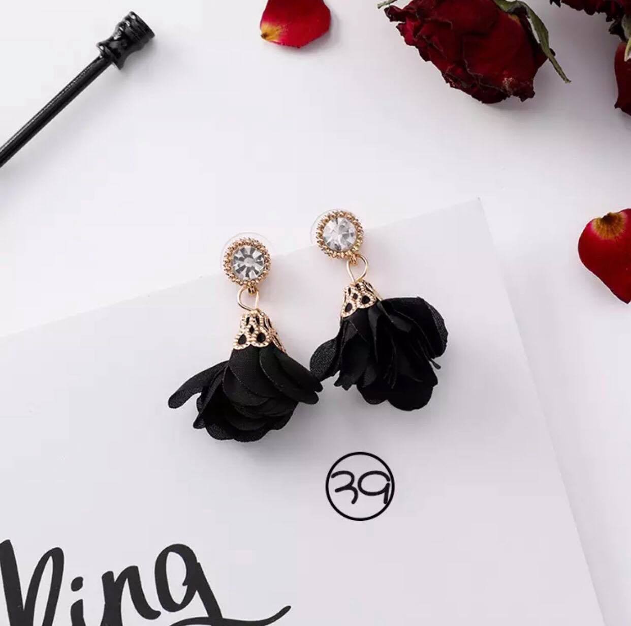 ARETE PETALOS NEGROS CON DIAMANTE