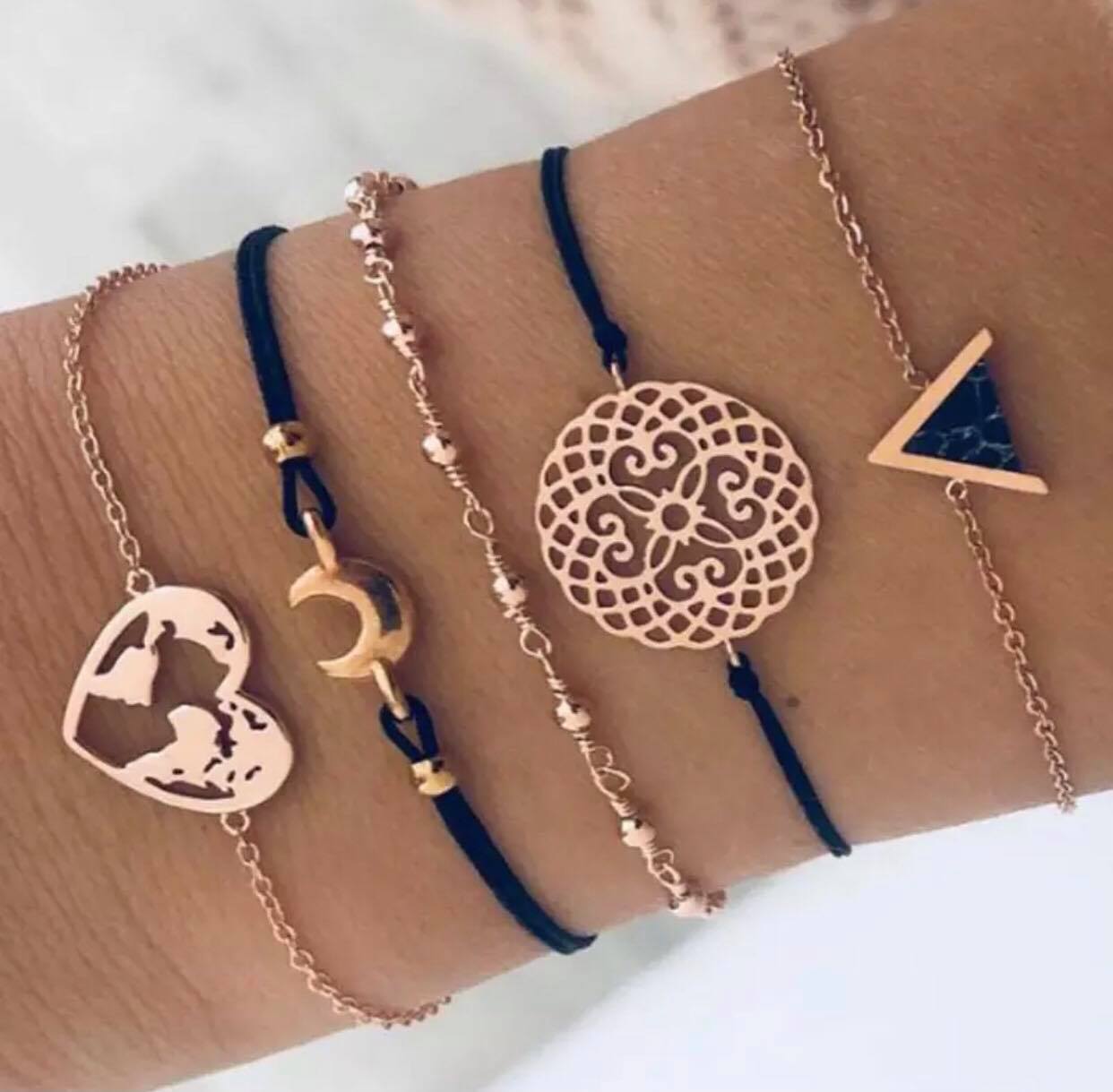 SET PULSERAS MUNDO CORAZON TRIANGULO NEGRA
